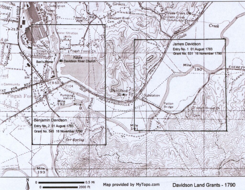 Benjamin Davidson was a surveyor who worked for the federal government. According to Ben Ormand, compiler of the history of the Brevard-Davidson River Presbyterian Church, Ben was laying out land boundaries as part of his employment when he also set aside land grants number one and two in Transylvania County for himself and his neighbor and relative James. Ben’s property contained the headwaters of a branch of the French Broad River.
