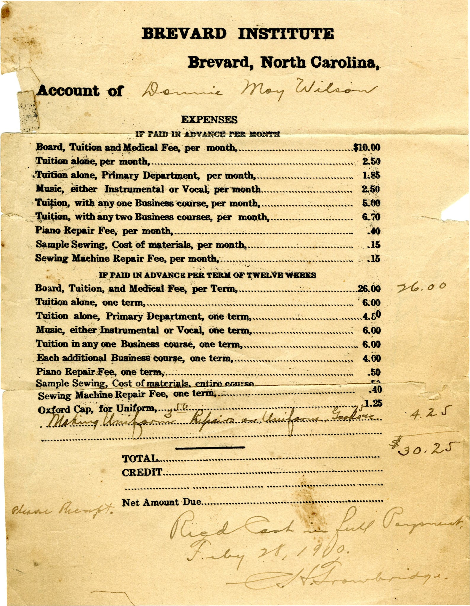 This Brevard Institute receipt shows a breakdown of possible expenses. This week Picturing the Past continues to feature items from a collection of County Commissioners documents of the early 1900s