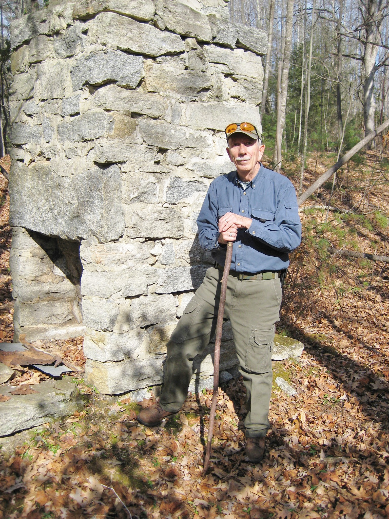 Carney beside the stone chimney of a former home site within DuPont State Recreational Forest. One of the document collections in the Rowell Bosse North Carolina Room at the Transylvania