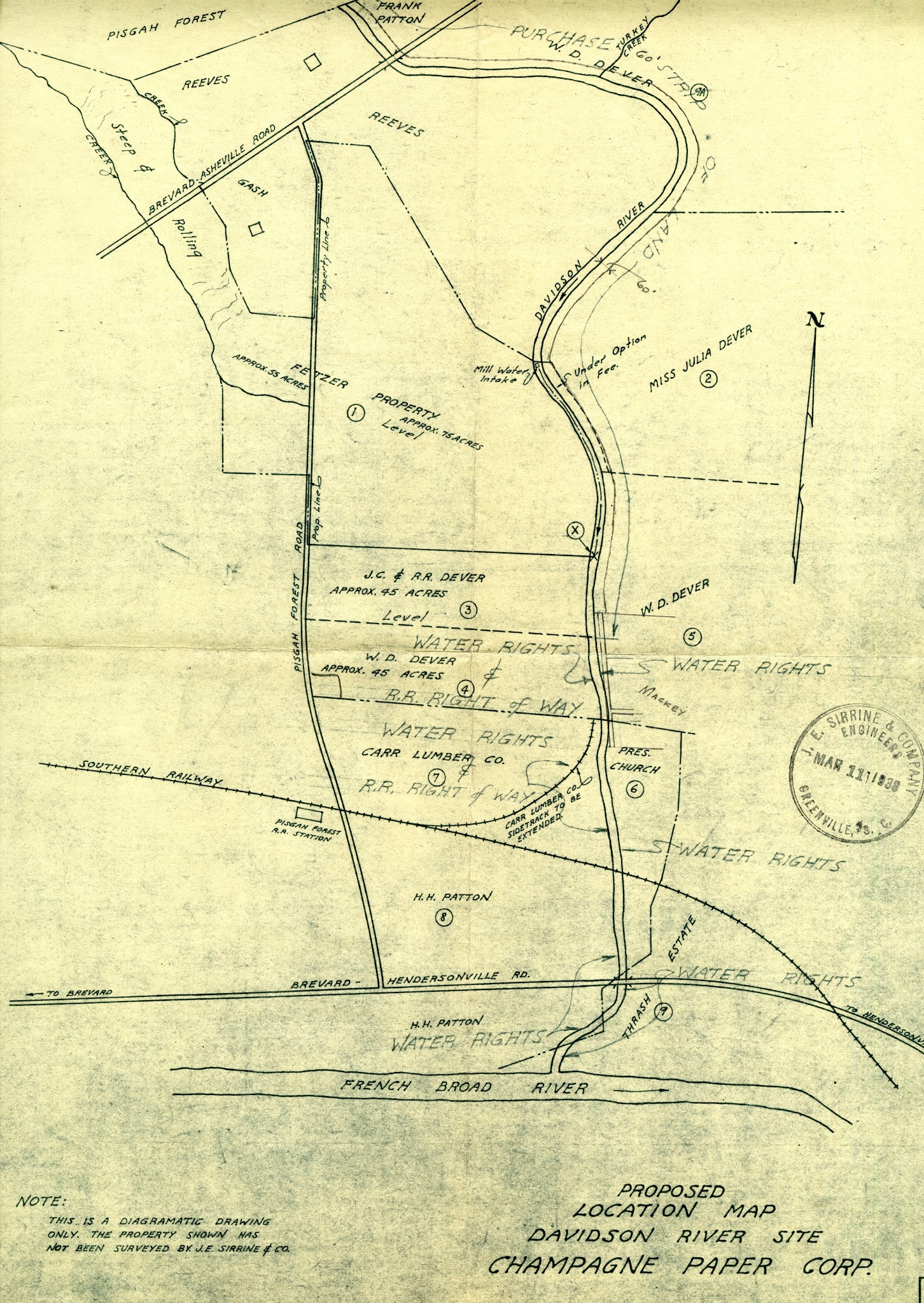Diagramatic drawing of proposed Davidson River site for Champagne Paper Corp., March 11, 1938. The Ecusta Collection consists of newspaper clippings, company publications, and photographs donated to the Local History