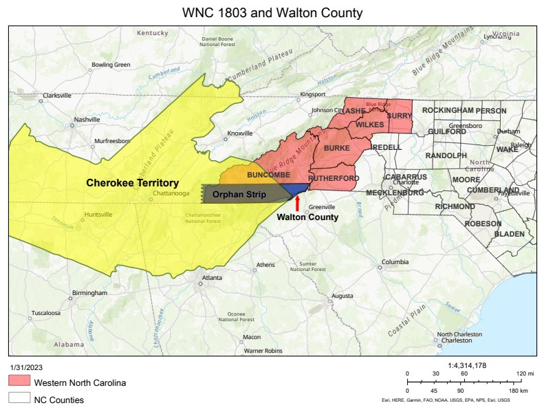In a document submitted to Congress in 1803 defining the land they now controlled based on Sturges’ report, Georgia officials described their new county by referencing both the Divisional and Meigs lines, as well as the Cherokee boundary, the Blue Ridge mountains, and where they crossed the 35th parallel.